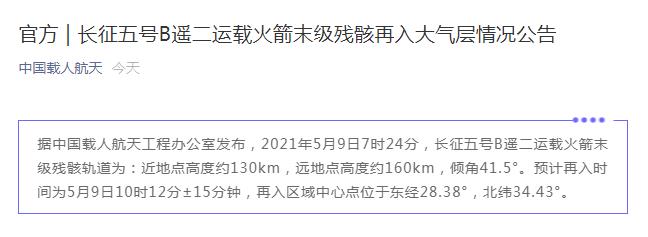 241981262021-05-09 10:43:24:612官方宣布长征五号b遥二运载火箭末级残骸再入大年夜气层环境再入 长征五号 末级 运载火箭 残骸 近地点高度 大年夜气层 载人航天工程 微信 官方宣布318234海内新闻海内新闻