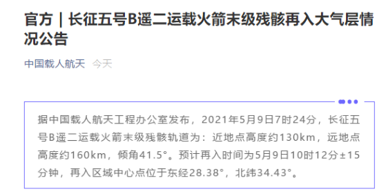 倾角41.5°估计再入光阴为5月9日10时12分±15分钟