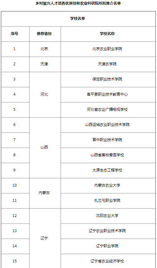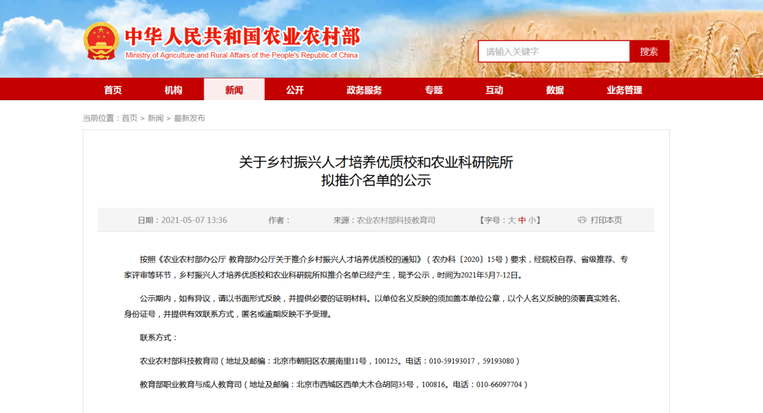 农业屯子子部科技教导司正式公示村庄子振兴人才培养优质校和农业科研院所拟推介名单(农业屯子子部网站)