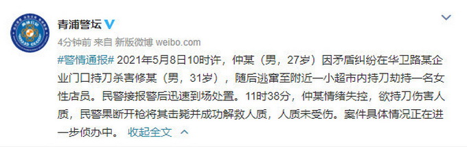 随后兔脱至相近一小超市内持刀挟制一名女性店员。夷易近警接报警后迅速参预处置。11时38分。