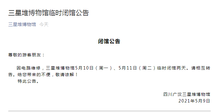 三星堆博物馆5月10日(周一)、5月11日(周二)临时闭馆两天