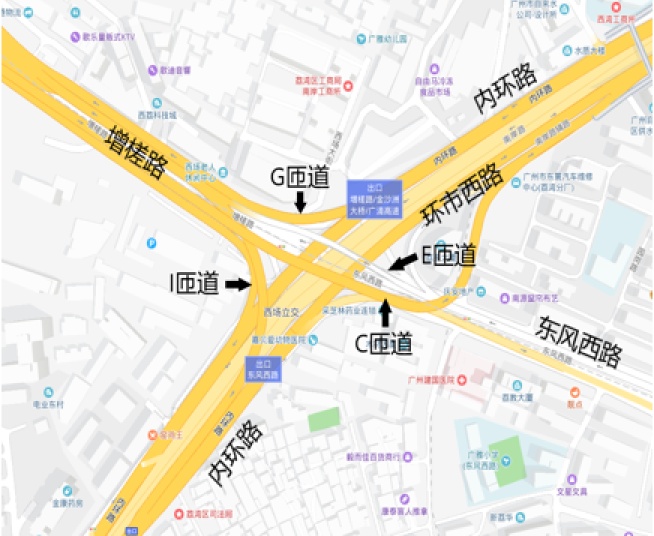 春风西西场立交东往西(春风西路往增槎路和金沙洲偏向)e匝道。