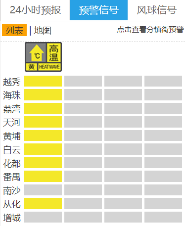 越秀、海珠、荔湾、河汉、黄埔、白云、花都、番禺、从化9个区都宣布了黄色高温预警旌旗灯号。