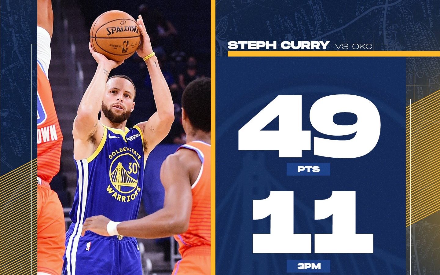这是库里职业生涯第12次单场至少射中11记三分球。