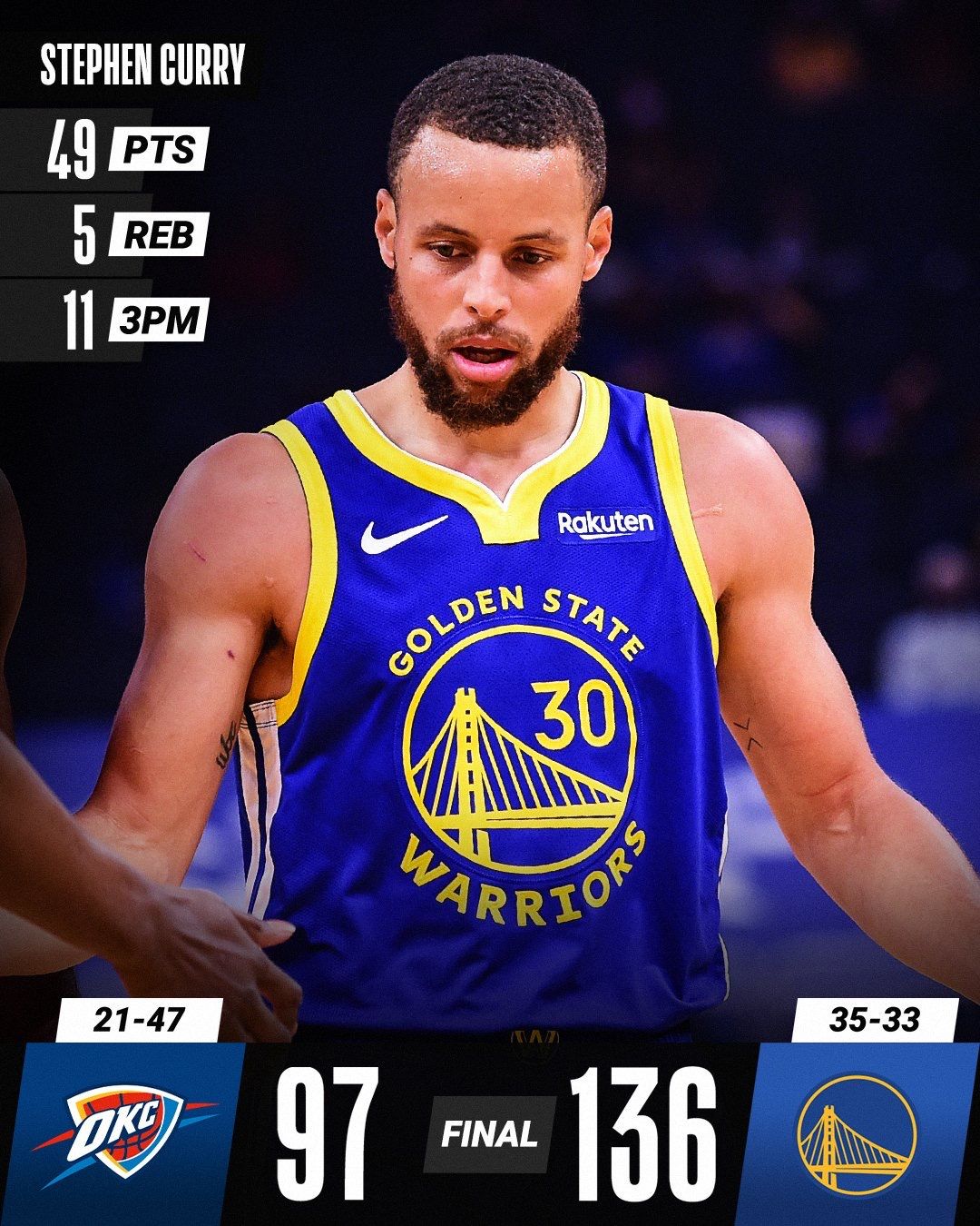 勇士以136比97大年夜胜对手39分。