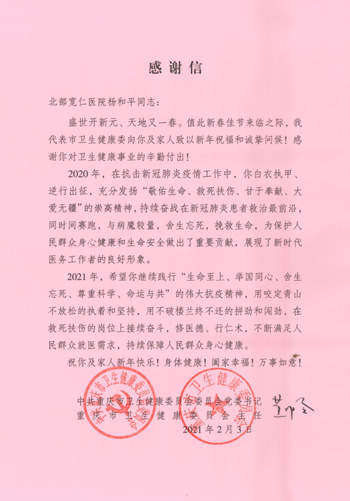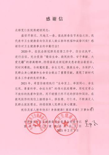 2021年新春佳节之际,重庆北部宽仁医院两位抗疫英雄:呼吸内科主任杨和平教授、重症医学科主任熊建琼教授收到市卫生健康委党委书记、主任黄明会的《感谢信》对他们在抗疫工作中的奉献给予表彰和感谢。