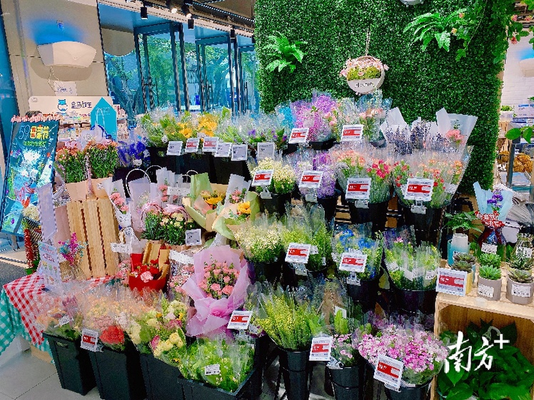 不少花店、商超鲜花售卖区的康乃馨、小雏菊等束花都热销。