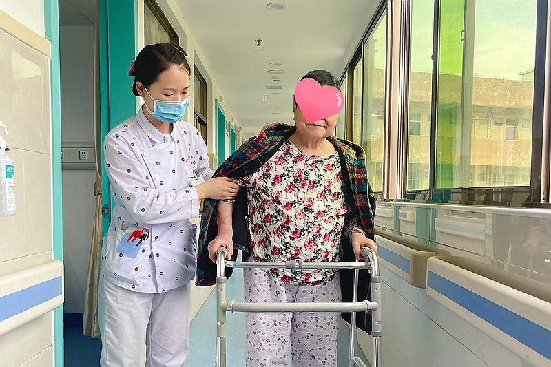 康复练习中的李姨妈在刘海琴的搀扶下