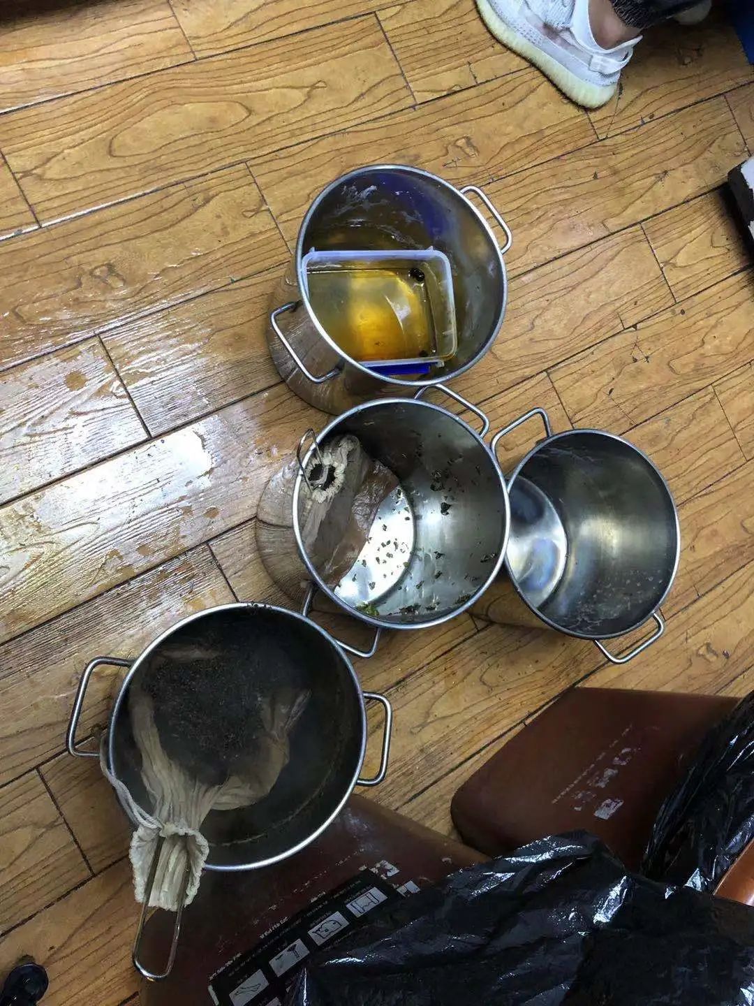 厨房地面潮湿脏乱,煮完的茶叶不及时清理,随意放置在地上。