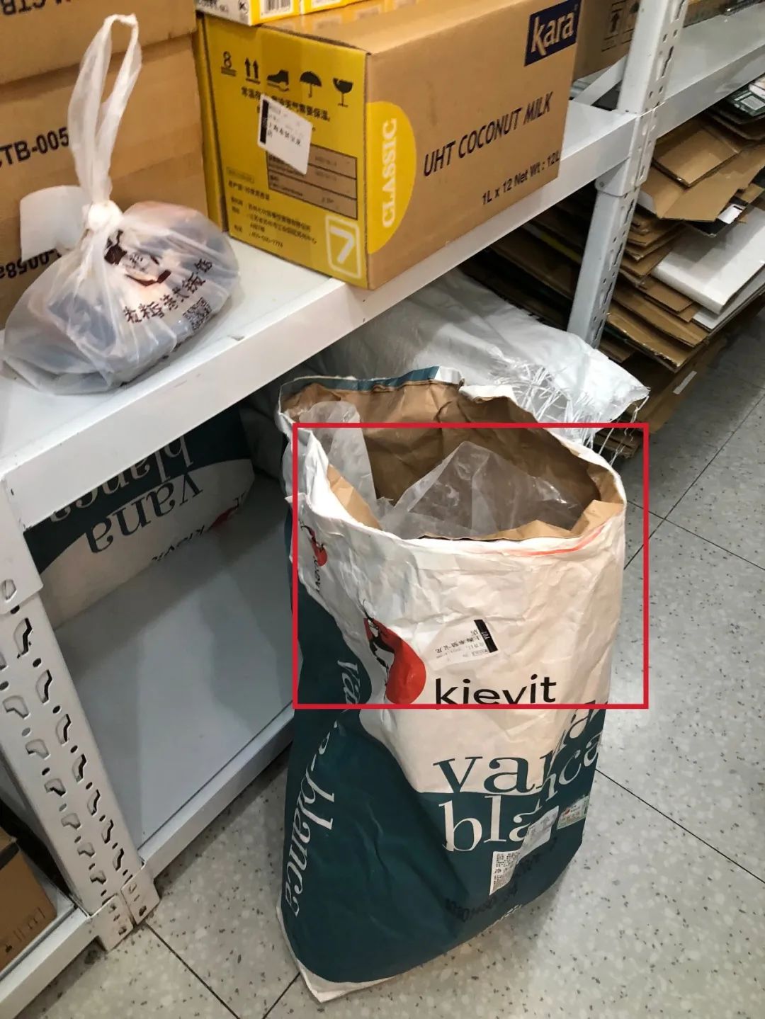 仓库内装原材料的袋子未封口。