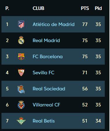 仍可争冠的球队包括马德里竞技、皇家马德里、巴塞罗那以及塞维利亚。