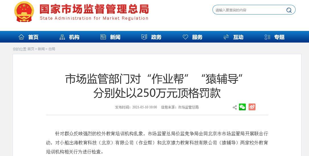 北京市市场监管局依法对功课帮和猿指点两家校外教导培训机构