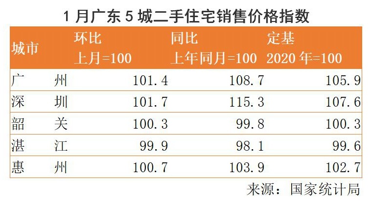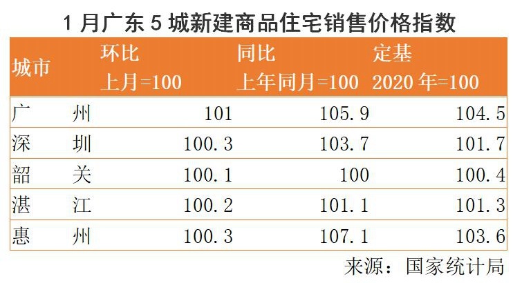 南方+记者注意到,在广东,广州、深圳、韶关、湛江、惠州等纳入统计的城市,1月份新建商品住宅价格均有不同程度的环比上涨,涨幅最高的广州为1%。而在二手房市场,除湛江环比下滑0.1%外,其余城市也有不同程度的上涨。