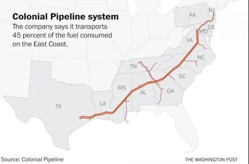 colonial pipeline在美国东海岸的运输管道。图源:《华盛顿邮报》
