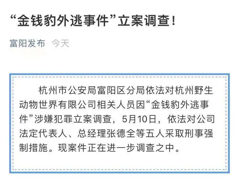 杭州市公安局富阳区分局依法对杭州野活跃物天下有限公司相关职员因“金钱豹外逃事故”涉嫌犯罪存案查询造访