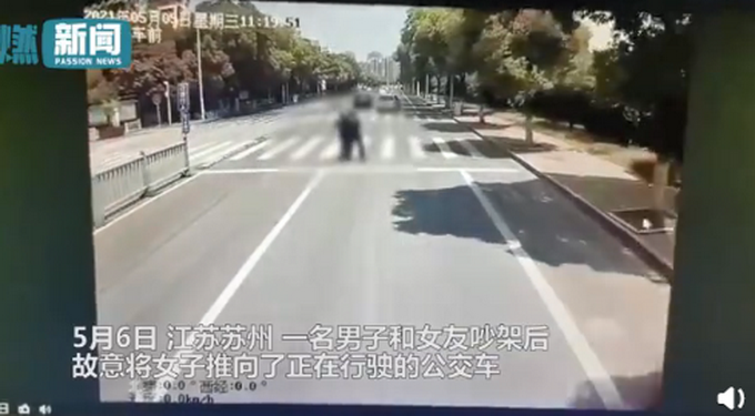 有意将女子推向了正在行驶的公交车公交车行车记录仪画面显示