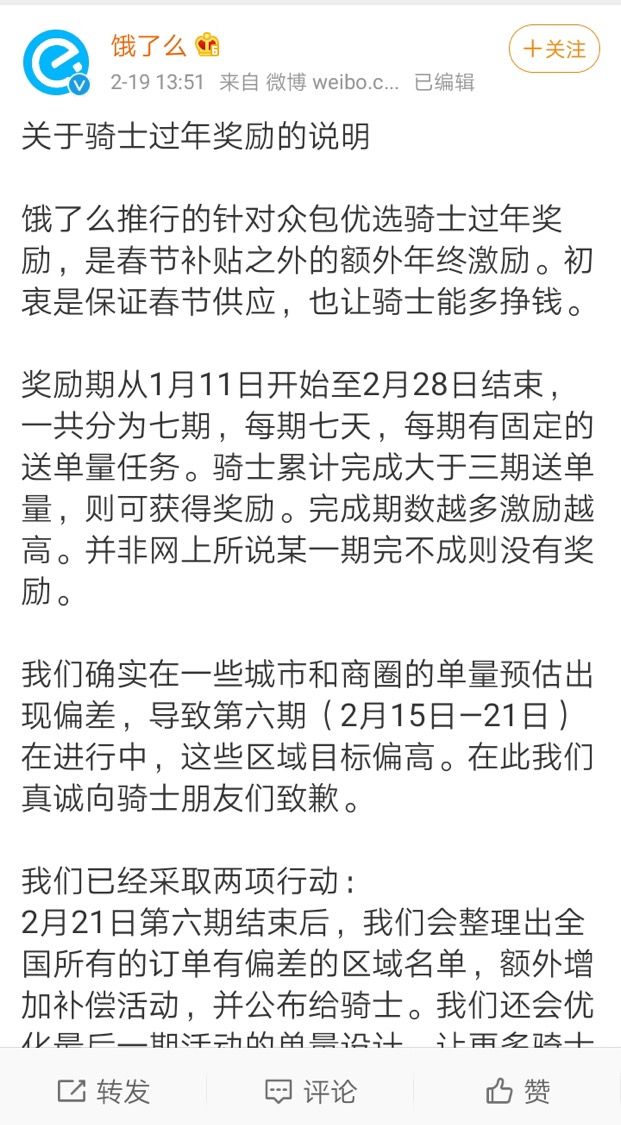 “我们确实在一些城市和商圈的单量预估出现偏差,导致第六期(2月15日—21日)在进行中,这些区域目标偏高。在此我们真诚向骑士朋友们致歉。”