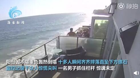 【美国一群男女海滨阳台上聚会 忽然脚下一空集体消掉尖叫坠入水中】当地光阴5月8日。 美国加利福尼亚州一处海滨房屋的阳台倾圯。 致2人重伤。监控画面显示。 事发时有10到15人凑集在阳台上参加聚会。 阳台因不堪重负轰然倾圯。 十多人瞬间齐齐摔落惊悸尖叫。 一名须眉逃过一劫。 捉住栏杆惊魂不决。