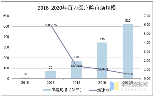 百万医疗险是近年来商业康健保障领域的重大年夜立异,经由过程设定较高的免赔额(一样平常为10000元),以较低的保费供给较高的保额——产品保额大年夜多在100万元阁下,件均保费500元以下,杠杆较高。保障范围一样平常包括住院医疗和恶性肿瘤医疗用度,可冲破基础医保的范围。因为产品设计简单,主要经由过程互联网渠道贩卖,广为破费者吸收获为其快速成长的缘故原由之一,百万医疗险保费收入由2016年的10亿元迅猛增长至2020年的520亿元,年复合增长率高达168.53%。