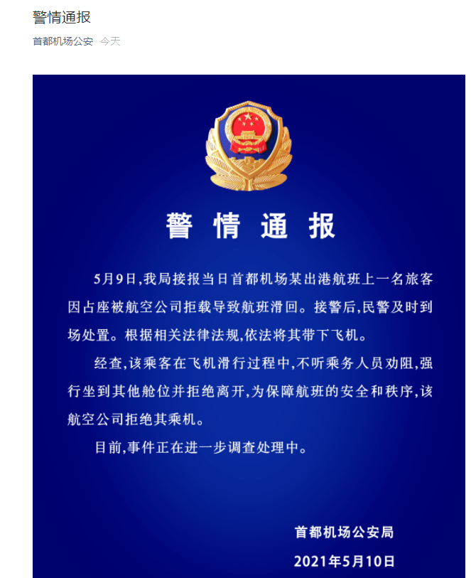 国都机场公安局接报当日国都机场某出港航班上一名搭客因占座被航空公司拒载导致航班滑回接警后夷易近警及时参预处置根据相关司执法例
