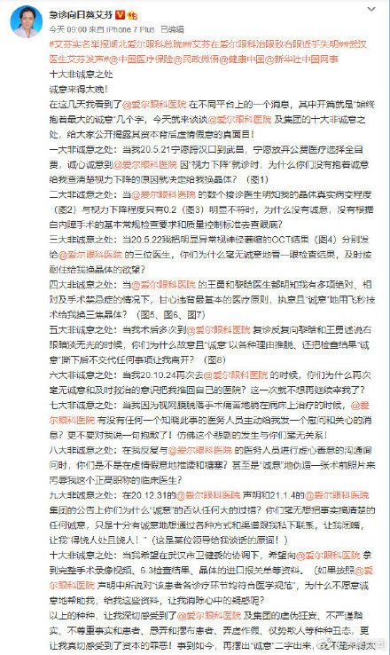 2月23日,武汉抗疫医生艾芬在其个人微博上对“爱尔眼科希望合法合规解决医疗纠纷”回应称,“诚意来得太晚”。艾芬列举爱尔眼科“十大非诚意之处”并表示,“事到如今,再摆出‘诚意’二字出来,是不是来得太晚了一点?”艾芬表示,目前正在自己所在的医院武汉市中心医院眼科治疗眼睛,没有依靠爱尔眼科医院的任何专家和力量来获得治疗和帮助。