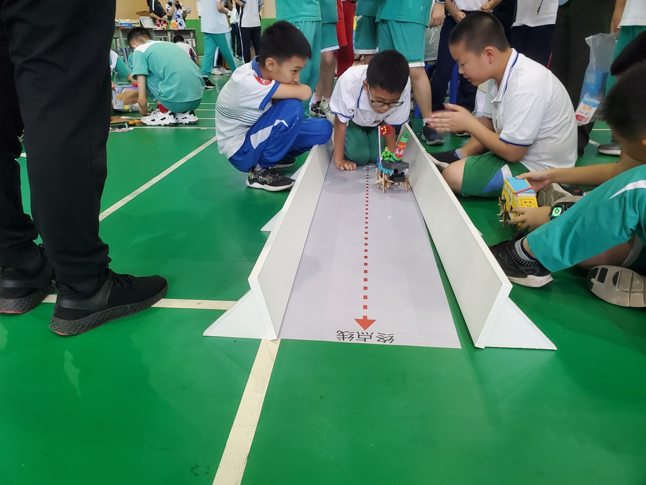 来自体育东路小学四年级的陈同砚和罗同砚制作的创意机械人在第一轮便成功在规准光阴内冲刺终点。
