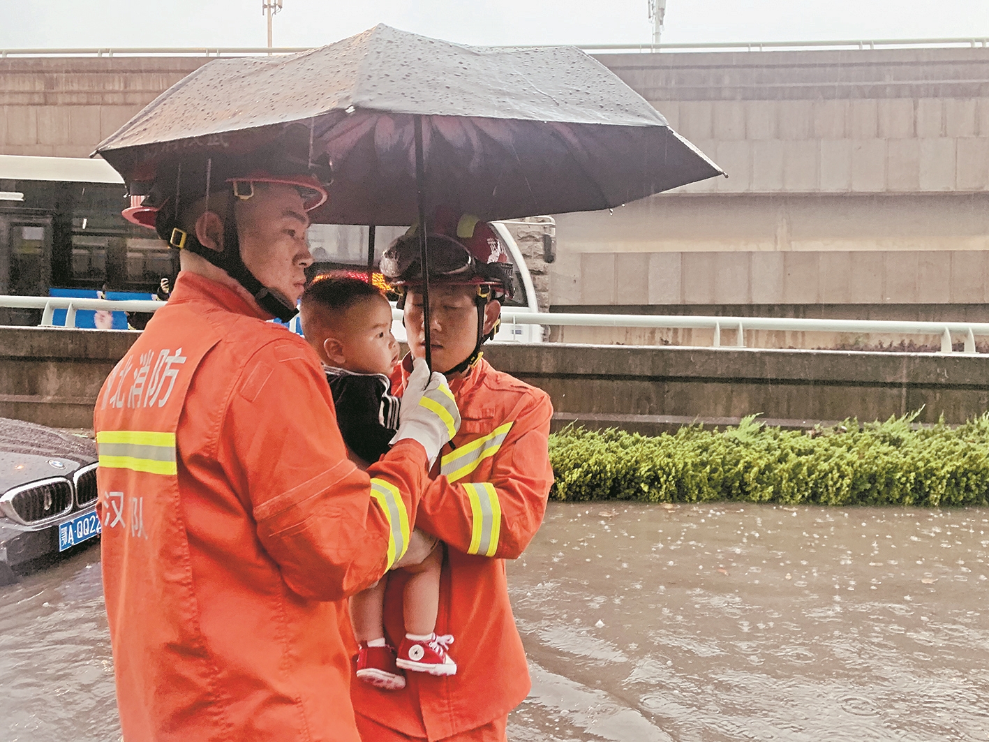 将水中被困轿车上的游客救出。 楚天都会报纵目新闻记者叶文波 通讯员汉消摄