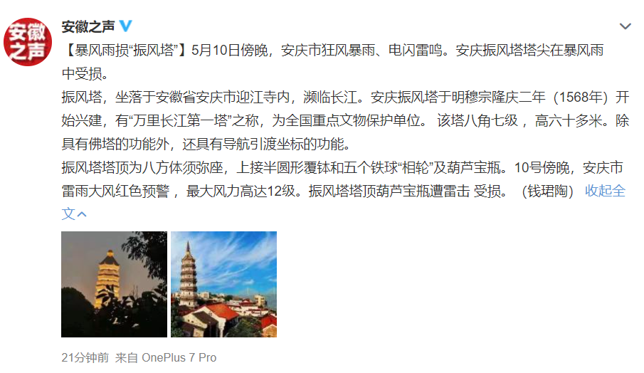 最大年夜风力高达12级。振风塔塔顶葫芦宝瓶遭雷击受损。