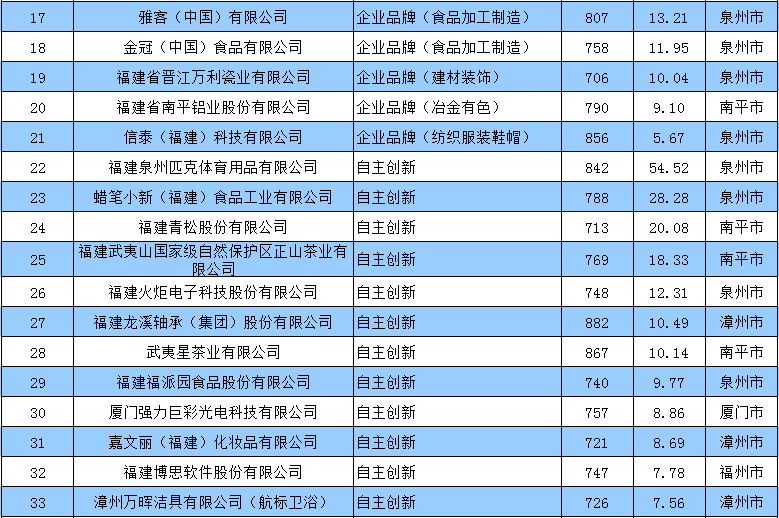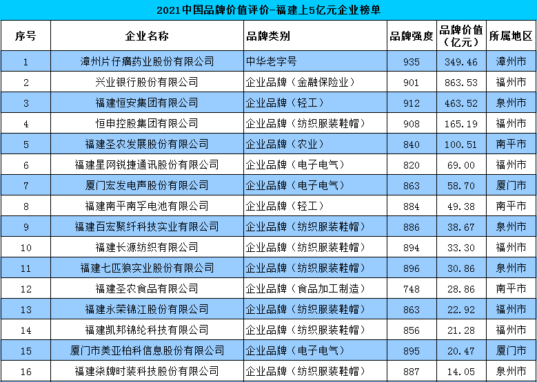 福建省兴业银行、恒安集团、片仔癀、圣农成长、恒申控股等企业品牌和安溪铁不雅音、武夷岩茶等区域品牌代价跨越百亿元。42家参评的企业品牌代价达到5亿元以上。
