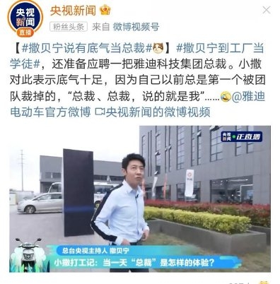 雅迪冠能2.0系列宣布会得到了央视势力巨子媒体的高度关注,在探厂直播中,撒贝宁一起开启总裁晋升之路,从“学徒”做起,走进雅迪数字化智能工厂,试驾雅迪冠能2.0系列产品,参不雅雅迪科创中间等环节,从产品体验到科技立异,周全懂得雅迪冠能2.0系列产品终极,雅迪冠能2.0系列产品以各方面绝对的优良成就得到了“新晋总裁”撒贝宁的高度认可