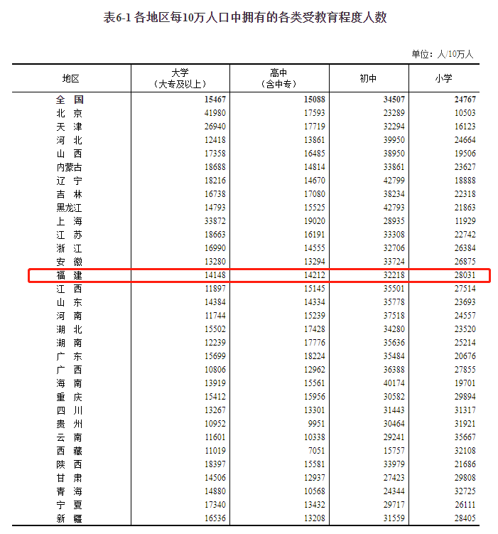 福建每10万人口中拥有大年夜学(指大年夜专及以上)文化程度的人数为14148人;拥有高中(含中专)文化程度的人数为14212人;拥有初中文化程度的人数为32218人;拥有小学文化程度的人数为28031人