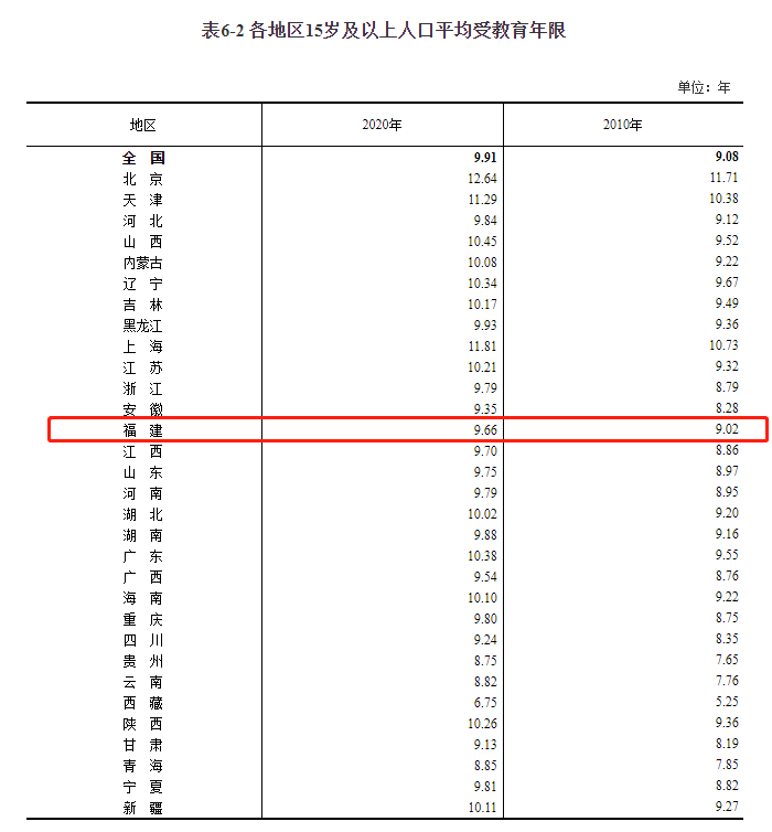 福建15岁及以上人口的匀称受教导年限为9.66年