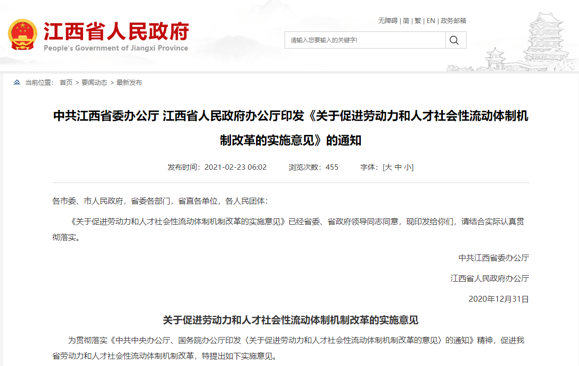 2月23日,江西省人民政府官网发布江西省委办公厅、江西省人民政府办公厅联合印发的《关于促进劳动力和人才社会性流动体制机制改革的实施意见》(下称《实施意见》),通过优化户籍制度和公共服务,激发社会性流动活力。