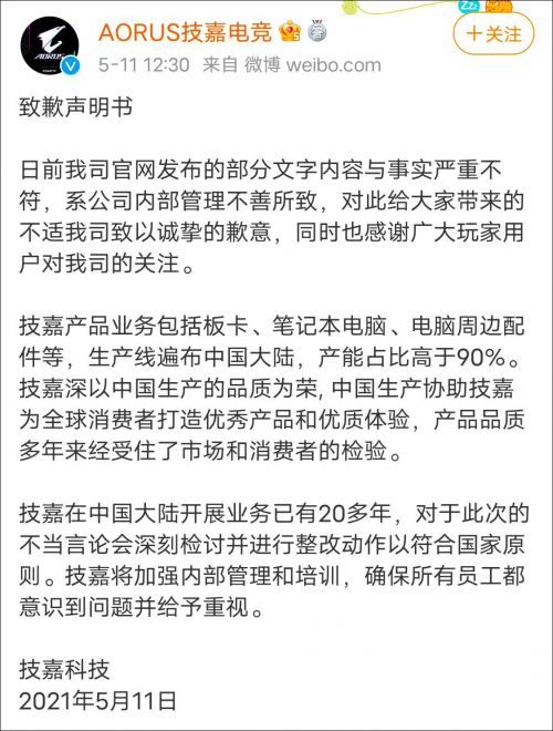 技嘉科技经由过程其旗下微博@ aorus技嘉电竞 宣布道歉声明。