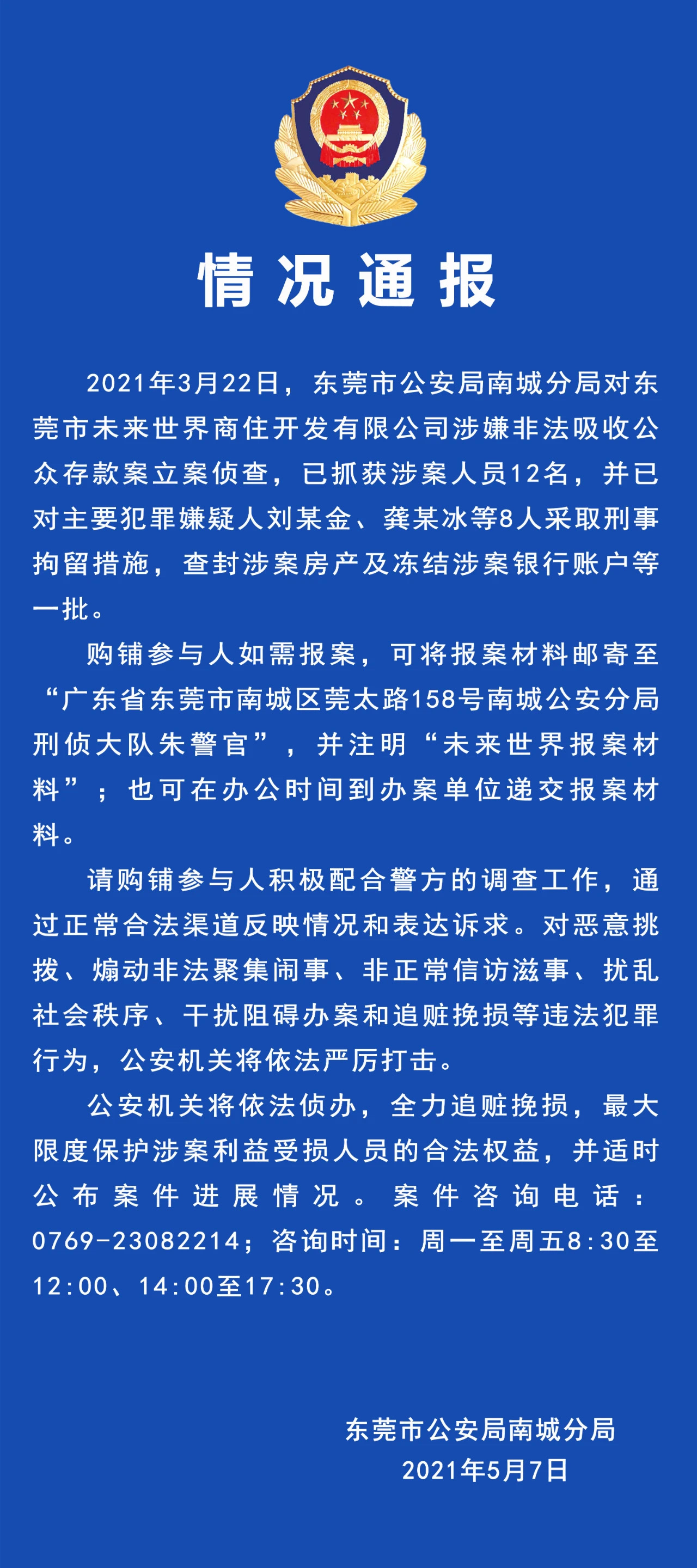 该公循分局对东莞市将下天下商住开拓有限公司涉嫌不法接受"民众,"存款案存案侦查。
