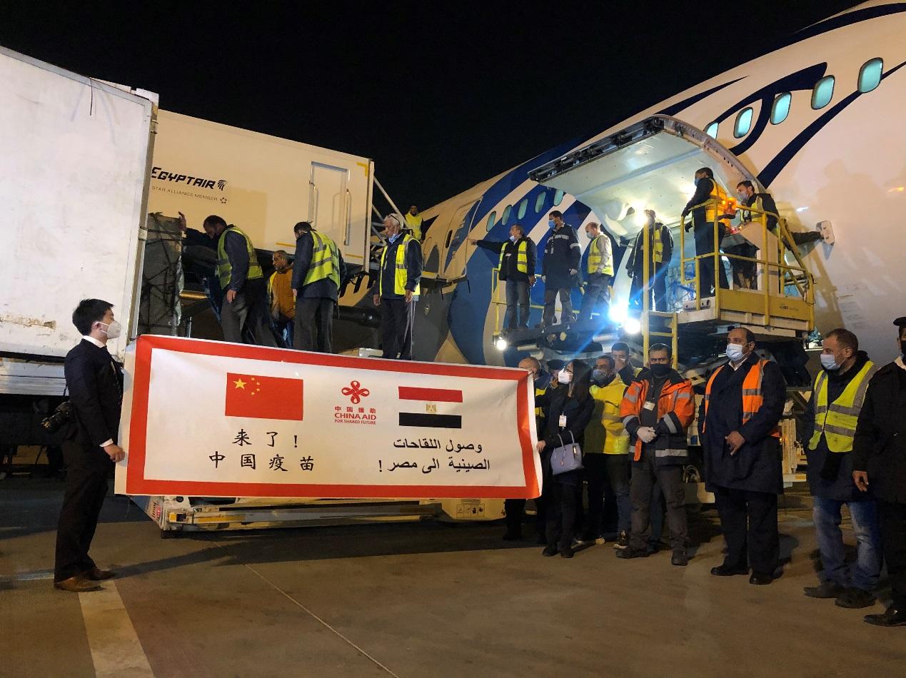 当地时间2月23日,中国援助埃及新冠疫苗从北京运抵开罗国际机场,埃及卫生与人口部副部长韦尔·萨伊等政府官员,以及中国驻埃及大使廖力强等使馆人员前往机场迎接。这批疫苗由中国国药集团生产。埃及卫生与人口部副部长韦尔·萨伊代表埃及卫生部接收了此批疫苗,并表达了对中国援助的感谢。