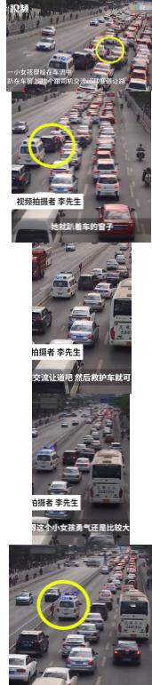 一辆救护车因蹊径拥堵无法前行。小女孩发明后穿梭在车流中。