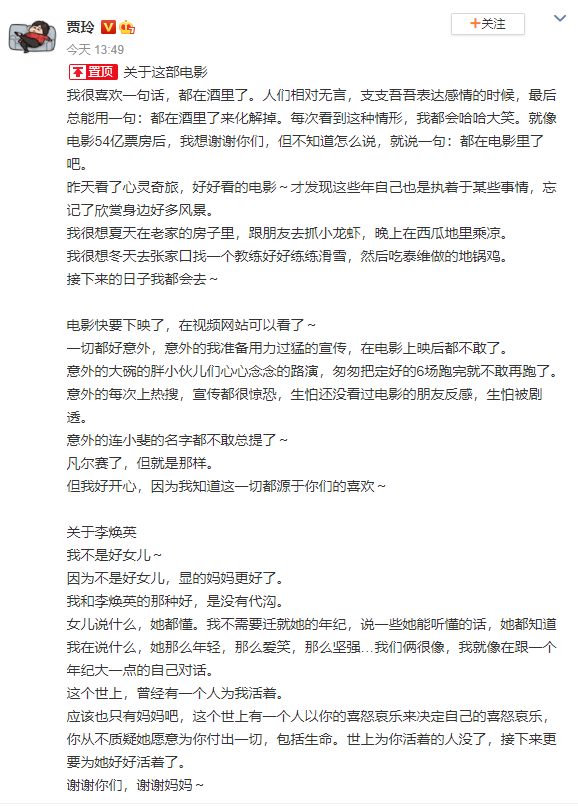 李焕英》的同伙表达谢谢:“就像片子54亿票房后。