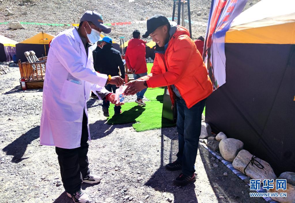 9日、ベースキャンプに入るチベット自治区登山協会職員の手を消毒する医師(チョモランマベースキャンプ=新華社記者/王沁鷗)