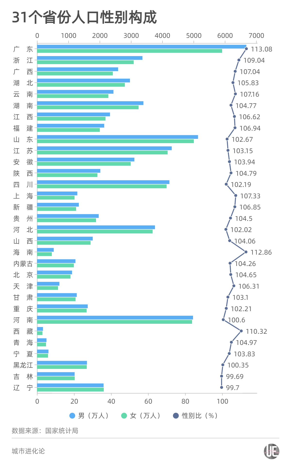 在110以上的省份有3个。广东、浙江男女数量差距最大年夜。
