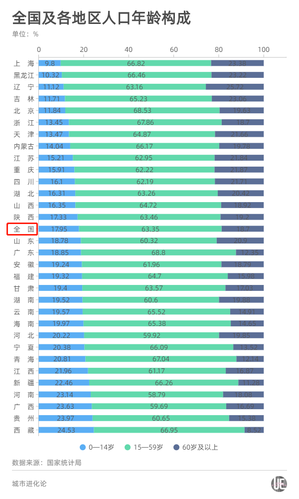 另有14个省份该年岁段人口比重低于全国匀称线(17.95%)。