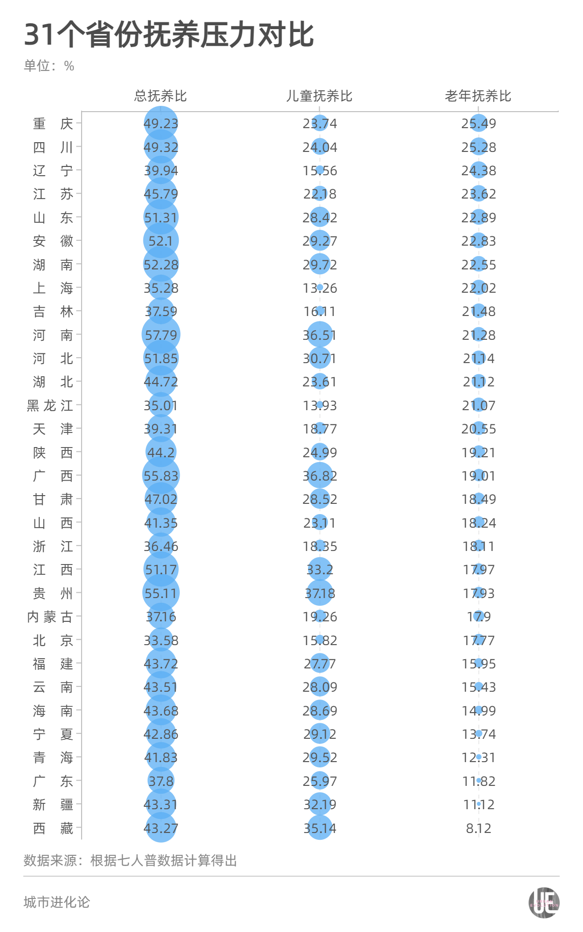 贵州、广西、河南、西藏、江西等5个省份儿童抚养比都在33%以上。