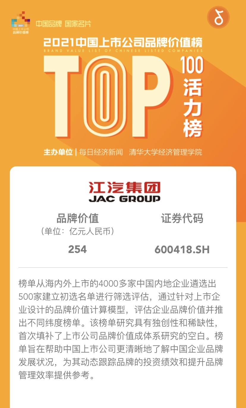 江淮汽车以60.8%的品牌代价增长率位居生气愿望榜top100第18位以前一年