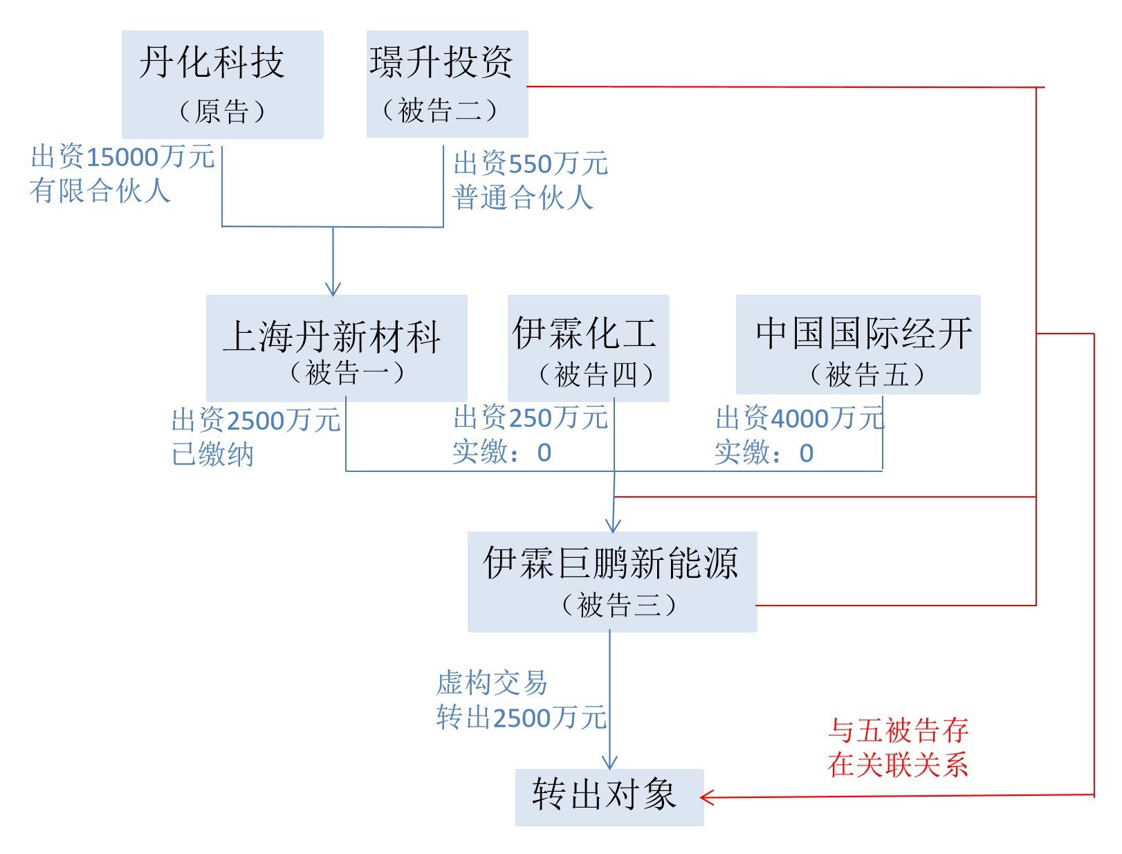 于2018年10月4日经由过程虚构买卖营业的要领将被告一上海丹新材科实缴出资的2500万元转出。该款项转出工具与五被告存在关联。