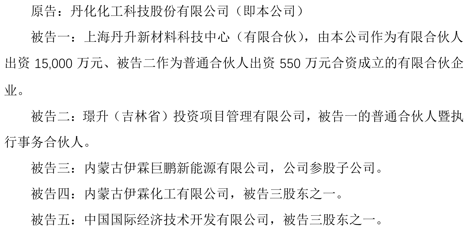 被告一上海丹新材科与被告四伊霖化工、被告五中国国际经济技巧开拓有限公司(以下简称“中国国际经开”)合营成立被告三伊霖巨鹏新能源。