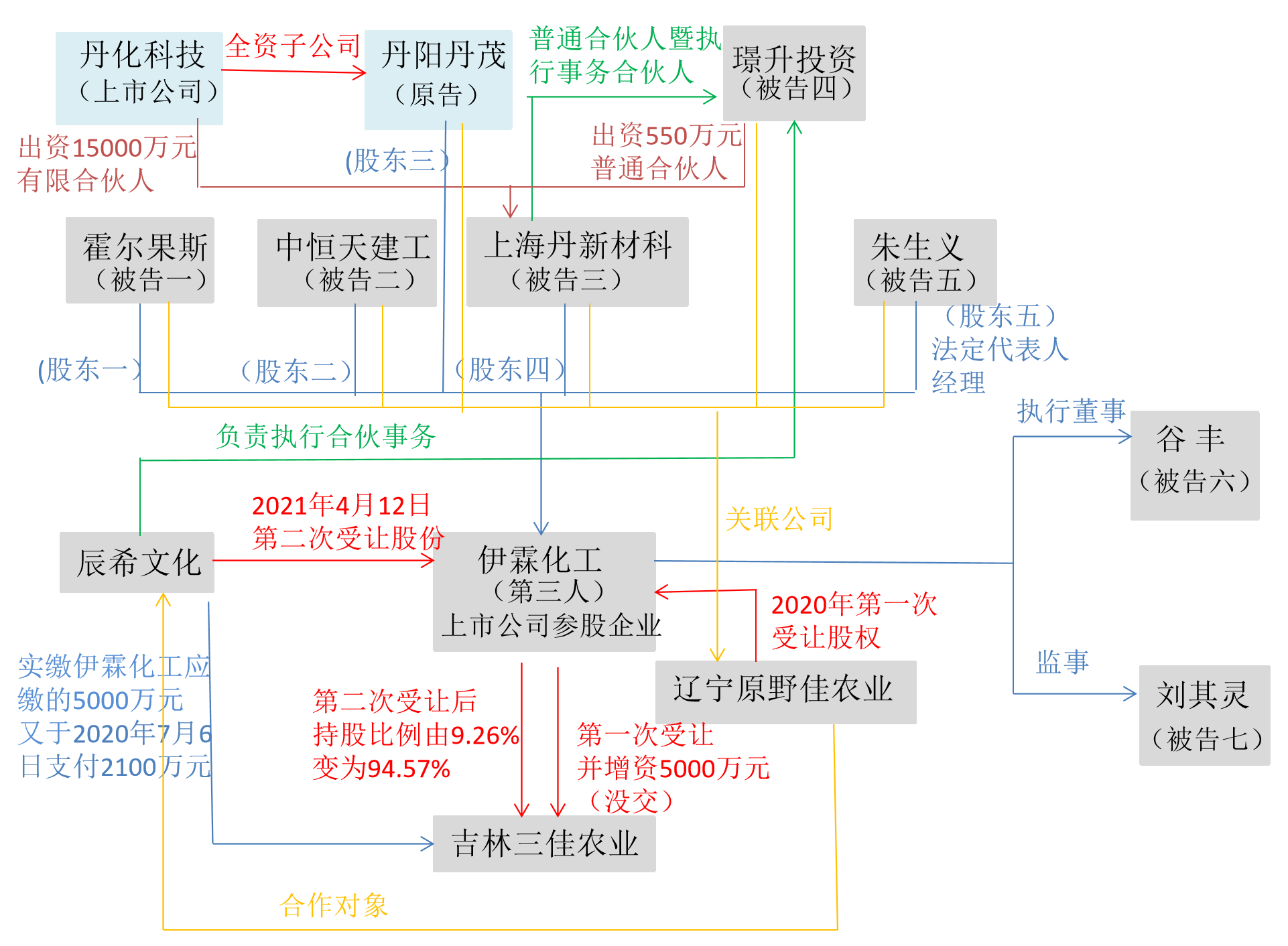 原告丹阳丹茂、被告一霍尔果斯润泽津润股权投资治理有限公司(以下简称霍尔果斯润泽津润)、被告二中恒天修建工程有限公司(以下简称中恒天建工)、被告三上海丹新材料科技中间(有限合股)(以下简称上海丹新材科)以及被告五朱生义皆为伊霖化工的股东。