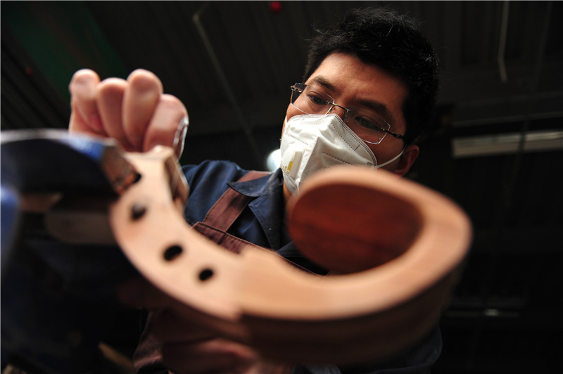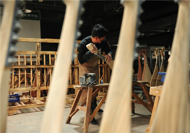 2月23日,河北省肃宁县一家民族乐器厂的工人在生产车间制作琵琶。