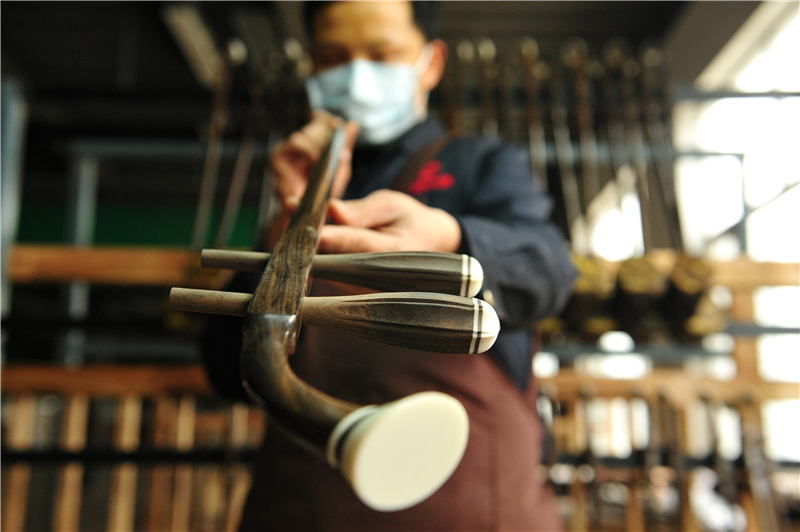 2月23日,河北省肃宁县一家民族乐器厂的工人在生产车间制作二胡。