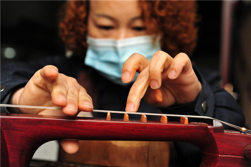 2月23日,河北省肃宁县一家民族乐器厂的工人在生产车间制作古筝。