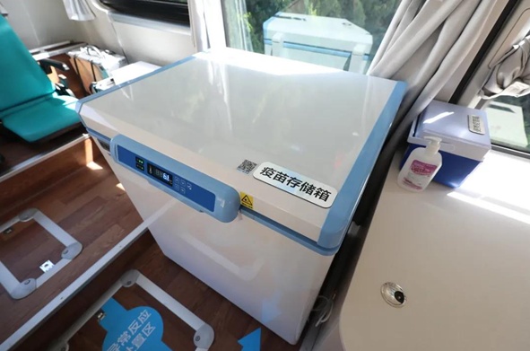 是以车上还专门配备了疫苗储存冰箱。